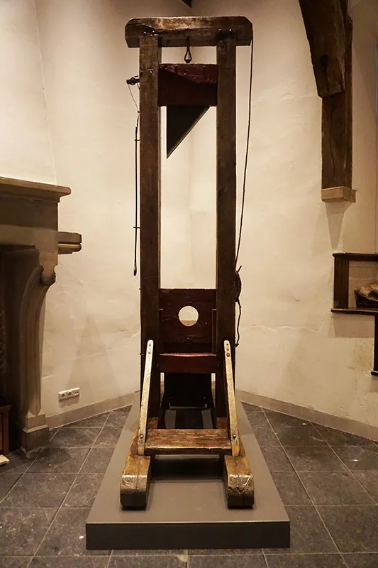 De hier getoonde guillotine is vermoedelijk begin negentiende eeuw in Frankrijk vervaardigd. In 2016 wist het museum dit bijzondere object aan te kopen. De machine is niet helemaal compleet. Er mist namelijk nog een bijltje, voor als de executie in eerste instantie niet lukte.