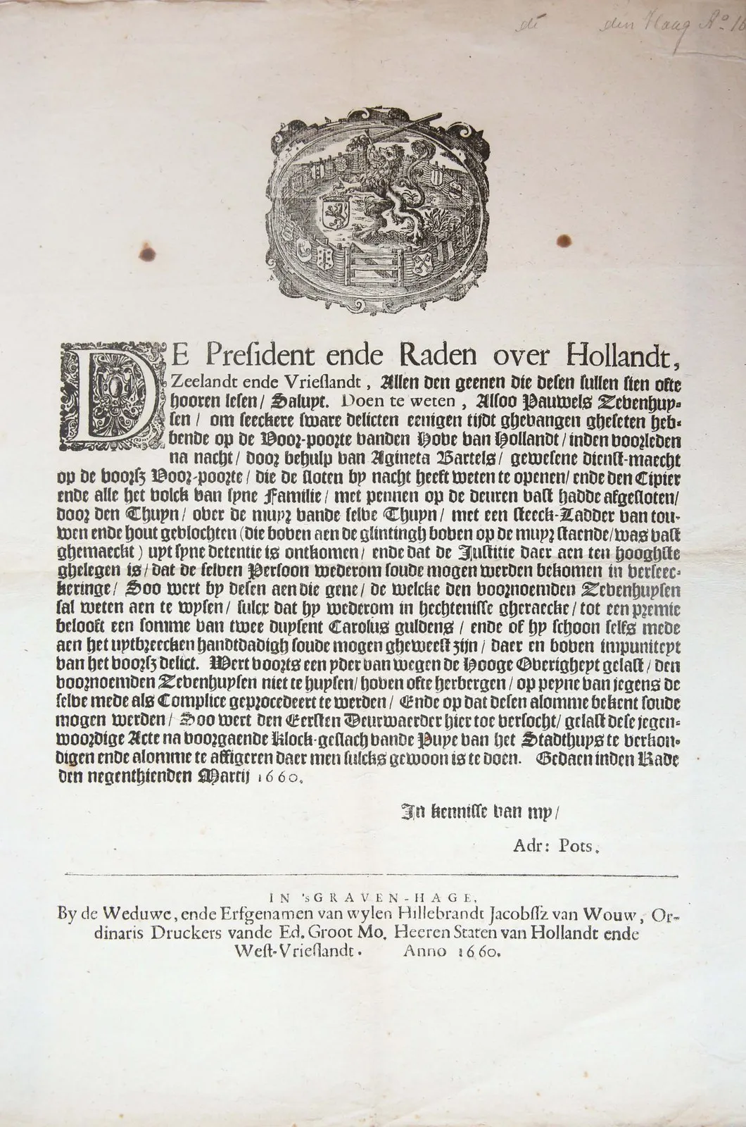 Ontsnappingen uit de Gevangenpoort kwamen niet vaak voor, maar als het gebeurde, dan was het wel altijd spectaculair. Zo slaagde een zekere Paulus van Zevenhuysen er in om met behulp van een dienstmeid te ontsnappen uit de Poort. Bij de autoriteiten gingen meteen alle alarmbellen af. Maar hoe werden de inwoners van Den Haag in de 17de eeuw eigenlijk op de hoogte gebracht van een voortvluchtige crimineel?
